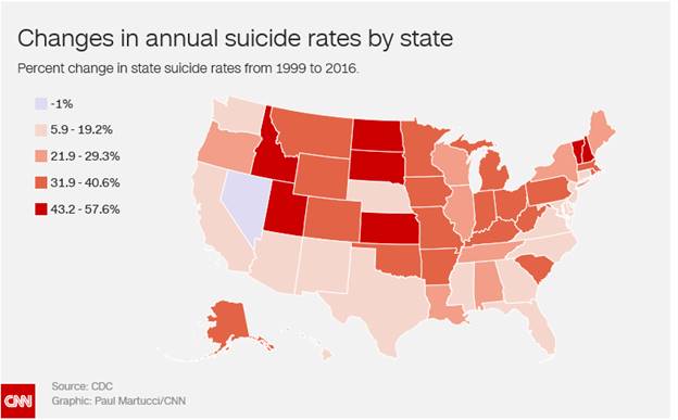 “These data, derived from the National Violent Death Reporting System, showed that 54% of those who committed suicide in 2015 did not have a known mental health condition. Digging deeper, the researchers found that several circumstances, including the loss of (or problems in) a relationship, were more likely to trigger a suicide among those who did not have a mental health condition.” Source: CNN “US Suicides Increased More Than 25% since 1999, CDC Says”